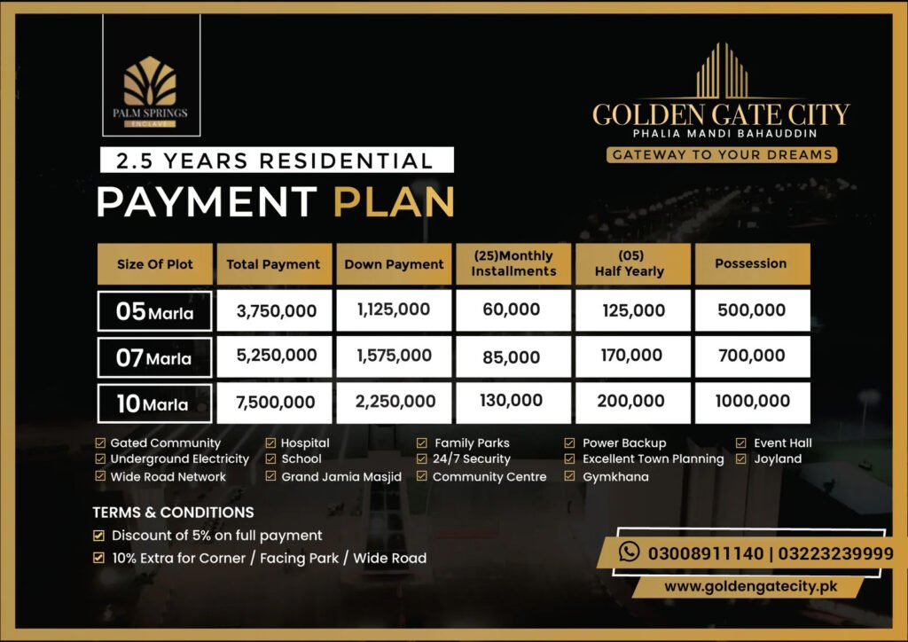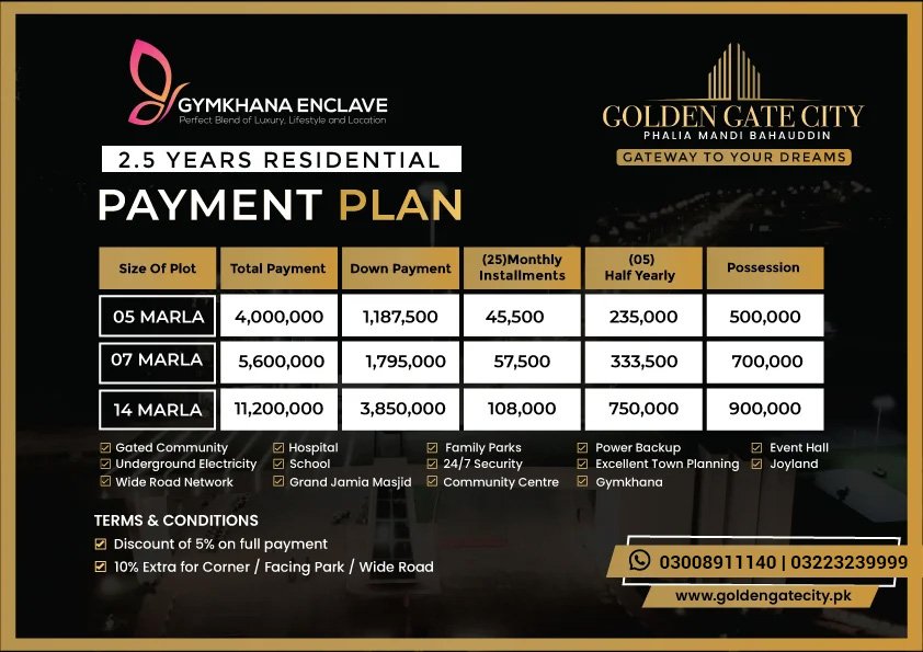 Welcome to Golden Gate City, nestled in the serene landscapes of Phalia, Mandi Bahauddin. Our meticulously planned urban oasis offers a perfect blend of convenience and tranquility, located just 4 km from Phalia and 6 km from Mandi Bahauddin. Boasting top-notch amenities such as an American School for quality education, a modern hospital ensuring round-the-clock healthcare, and 24/7 security for peace of mind, Golden Gate City prioritizes the well-being and comfort of its residents.
